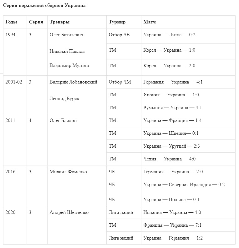 Самая длинная полоса фиаско сборной Украины случилась в 2011 году, во время подготовки к домашнему чемпионату Европы. Тогда подопечные Олега Блохина проиграли четыре спарринга подряд с общим счетом 3:12 (этой осенью при Шевченко было 2:13).
