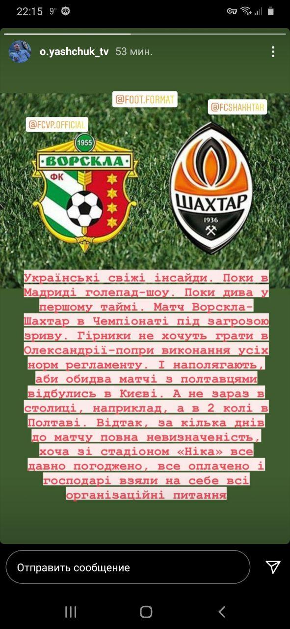 Журналист "Футбольного формата" Олег Ящук в своем Instagram поделился информацией относительно матча "Ворскла" - "Шахтер".