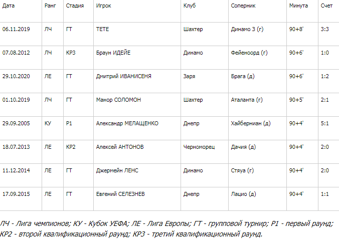 Самые поздние голы украинских клубов в еврокубках (в основное время матчей)