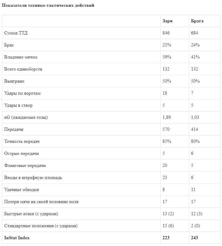 Самым полезным игроком Зари в поединке с Брагой по оценкам InStat стал полузащитник Дмитрий Иванисеня. Рейтинг эффективности его игры, InStat Index, составил 288 баллов. В тройку лучших футболистов матча также вошли Владислав Кочергин (262) и Ловро Цвек (249).