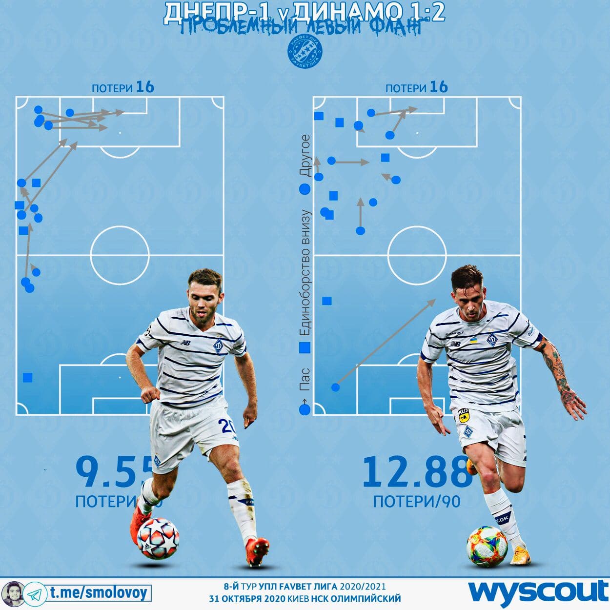 Блогер Михаил Смоловой поделился статистикой по игре футболистов "Динамо" в матче с "Днепром-1" (2:1).