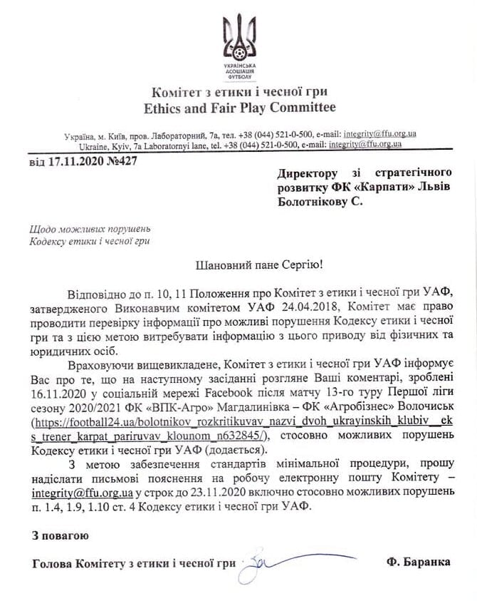 Директор по стратегическому развитию «Карпат» Сергей Болотников получил письмо от комитета по этике и честной игре УАФ.