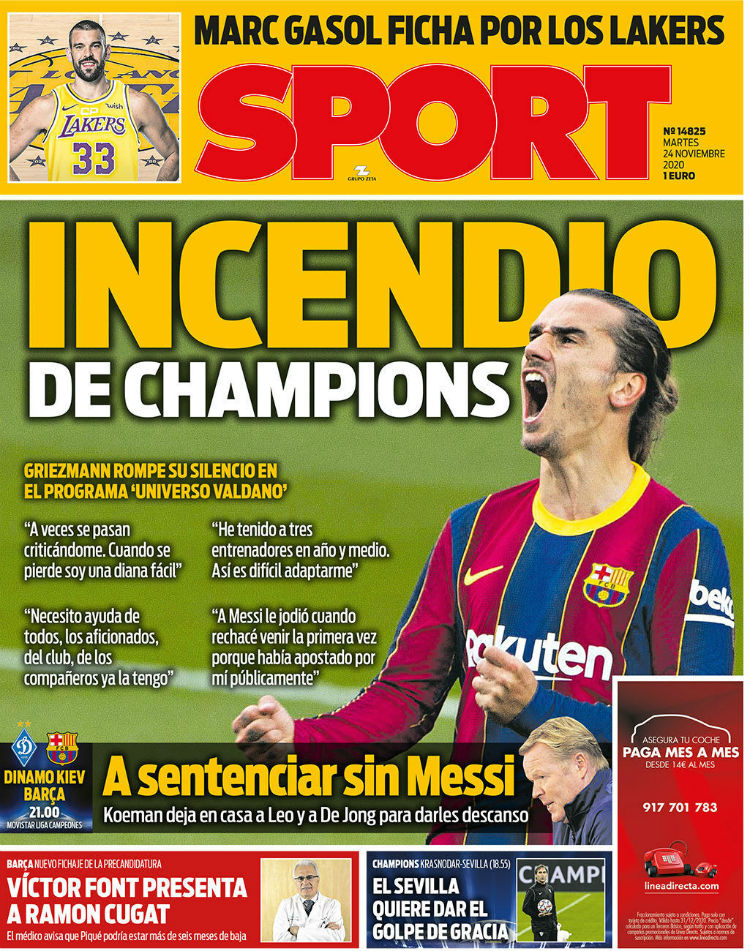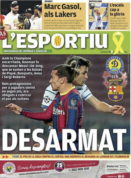 Сегодняшняя первая страница каталонского издания L`Esportiu посвящена матчу ЛЧ Динамо — Барселона. Громкий заголовок, что-то вроде «Разоружить», коллеги проиллюстрировали фото с игры соперников на Камп Ноу и логотипами команд, пишет zbirna.com.