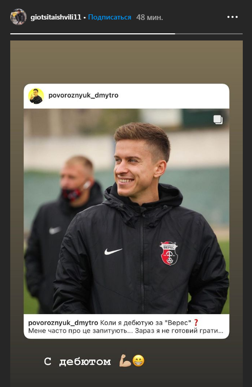 Полузащитник "Динамо" Георгий Цитаишивли поздравил блогера Дмитрий Поворознюка с дебютом за "Верес".