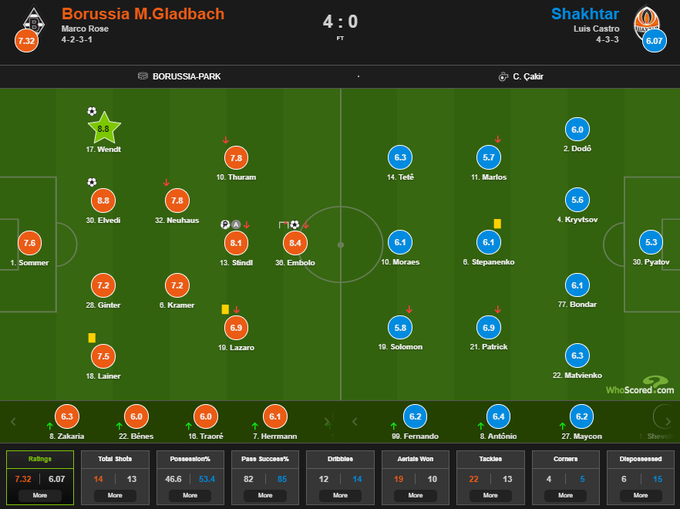 Оценки за матч 4-го тура Лиги чемпионов «Боруссия» М – «Шахтер» (данные WhoScored)