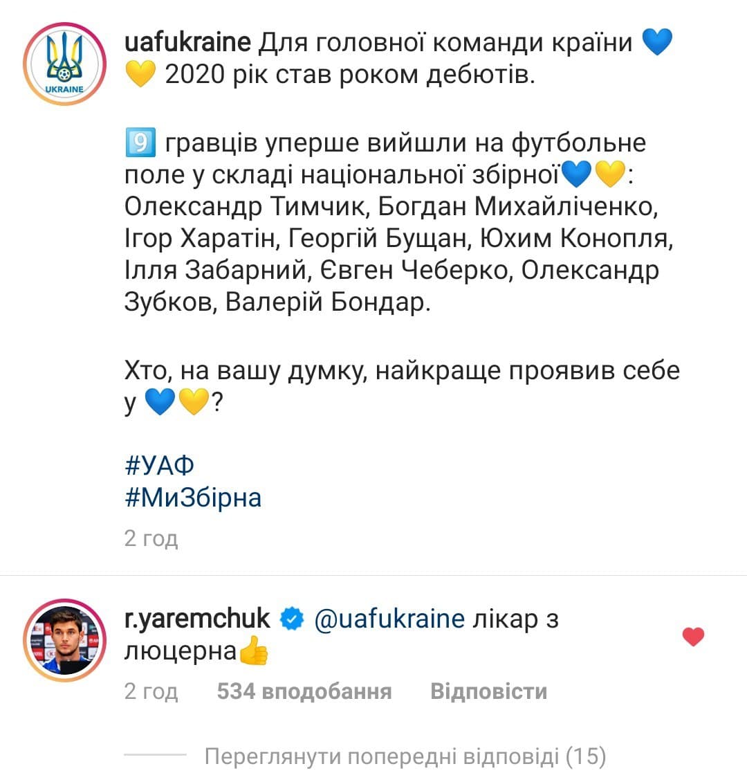 Нападающий сборной Украины Роман Яремчук в иронией отреагировал на пост в официальном Instagram УАФ, посвященном дебютам игроков в национальной команде в 2020 году.