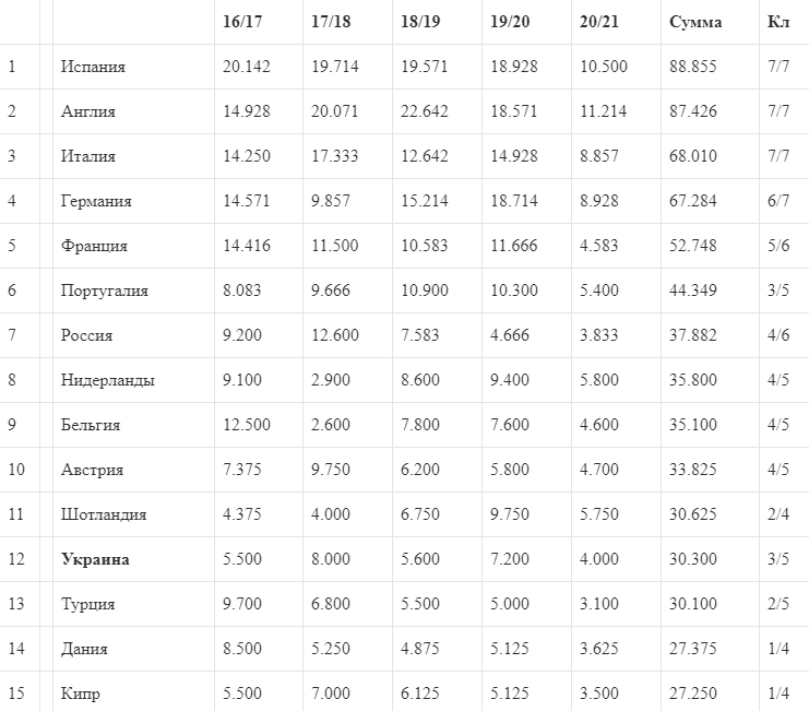 Добавим, что 12-я позиция в таблице коэффициентов УЕФА, на которой мы сейчас находимся, имеет квоту в еврокубках на лето 2022 года из пяти клубов: два - в Лиге чемпионов (один - во втором квалификационном, один - в плей-офф раунде), один - в Лиге Европы (в плей-офф раунде) и два - в Лиге конференций (один - во втором квалификационном, один - в третьем квалификационном раунде).