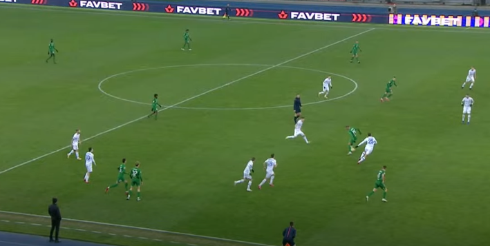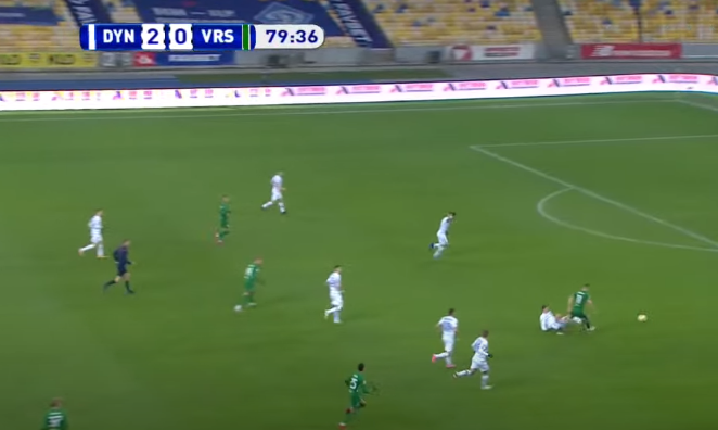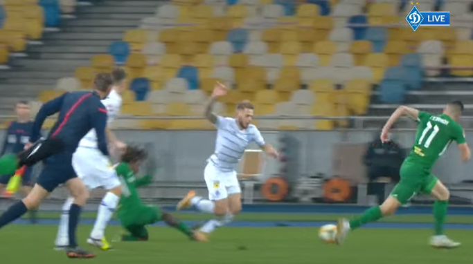 Но! И это самое главное! В момент передачи Руслан Степанюк находится в явном офсайде. Здесь даже линии рисовать не надо, потому что это четко видно по стрижке газона на "Олимпийском". Форвард "Ворсклы" на шаг ближе к воротам "Динамо". Значит, офсайд должен был зафиксироваться раньше, нежели фол.