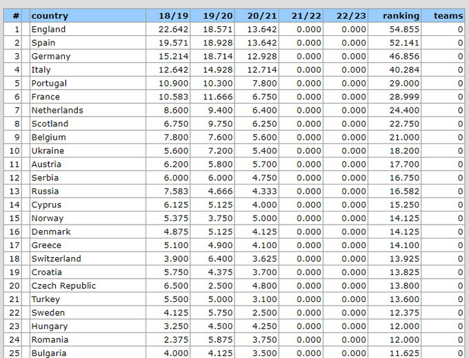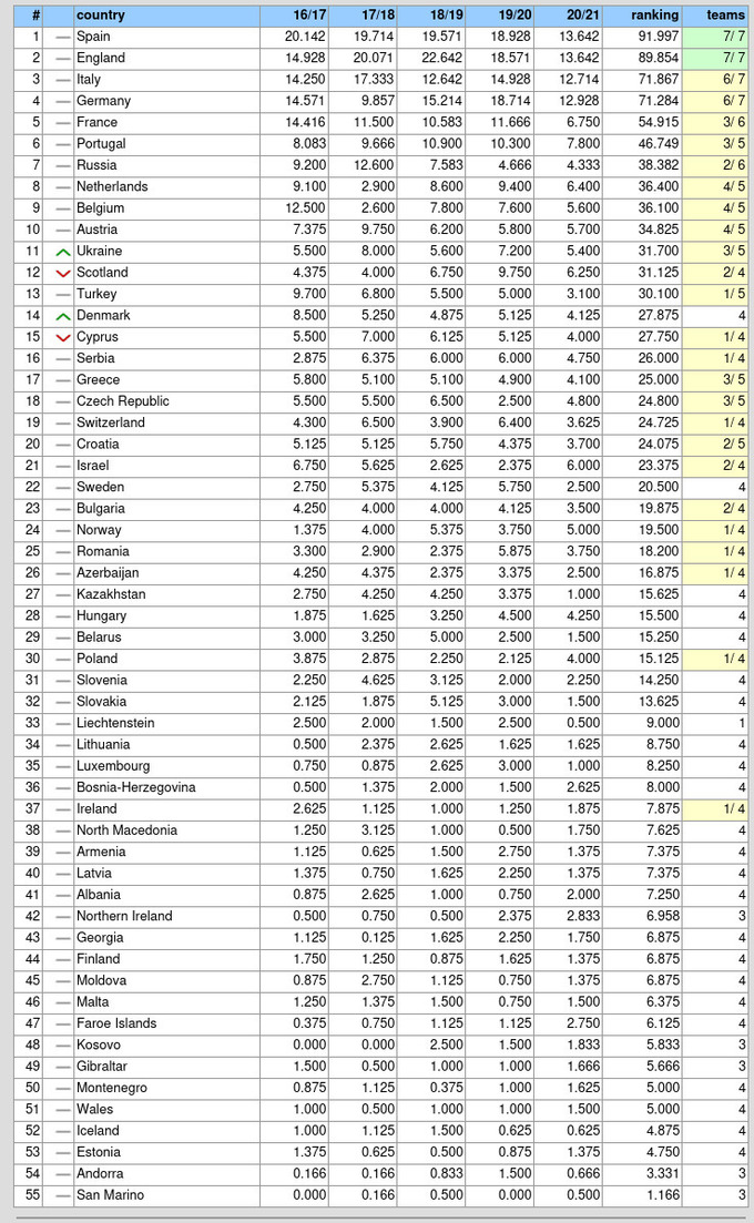 Таблица коэффициентов УЕФА 2021 (влияет на распределение путевок в сезоне 2022/23)