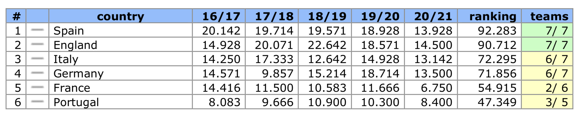 Ни Англия, ни Германия не смогли обойти своих ближайших конкурентов в последнем туре групповых турниров. Ждём продолжения интересной борьбы тем более пары Испания/Англия и Италия/Германия имеют одинаковое количество команд, семь и шесть соответственно. Франция потеряла ещё трёх представителей и теперь только ПСЖ и Лилль, а Португалия сохранила всех своих представителей в групповых турнирах и Порту, Бенфика и Брага продолжают своё шествие в еврокубках.
