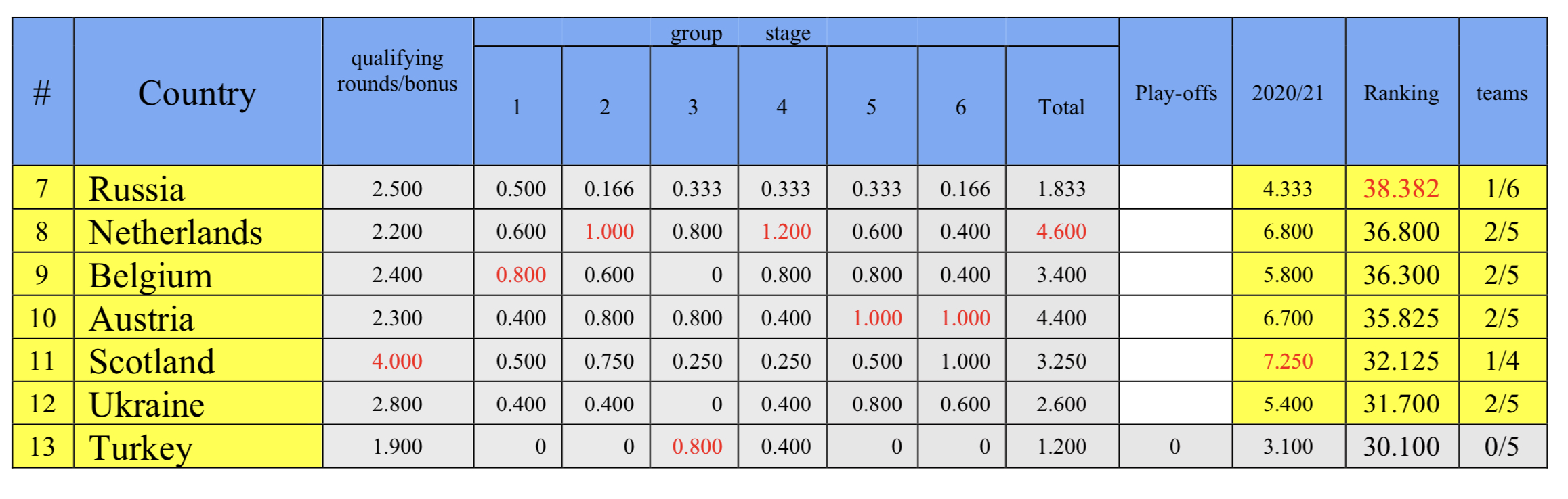 Ну вот и развязка групповых турниров. Теперь у Украины есть определённое преимущество перед Шотландией, а именно два представителя против одного Рейнджерса и всё как говориться в наших "ногах". Турция больше нам не соперник так что можно исключить её из нашей таблицы и весной уже продолжим более внимательно наблюдать за шестью командами с 7 по 12 места. Нидерланды, Бельгия и Австрия имеют, как и наши по два клуба весной. Можем ли мы догнать Австрию, ну учитывая жеребьёвку более серьёзно поговорим об этом после 1/16 Лиги Европы. Пока бы я сказал надо сосредоточиться на хорошем результате за сезон 20/21 где матч Динамо и Брюгге будет ключевым, ведь выбей Динамо ещё одного бельгийского представителя, и мы обойдём их хотя бы в рейтинге за этот сезон. У Австрии есть шанс закончить на этом этапе, всё же лидера английского чемпионата (Tottenham) и четвёртую команду Испании (Villareal) на данный момент будет ой как не просто пройти, да и набрать очки с ними будет проблематично. А вот у Нидерландов видится перспективное будущее этой весной и с набором очков в рейтинг и с продвижением по турнирной сетке