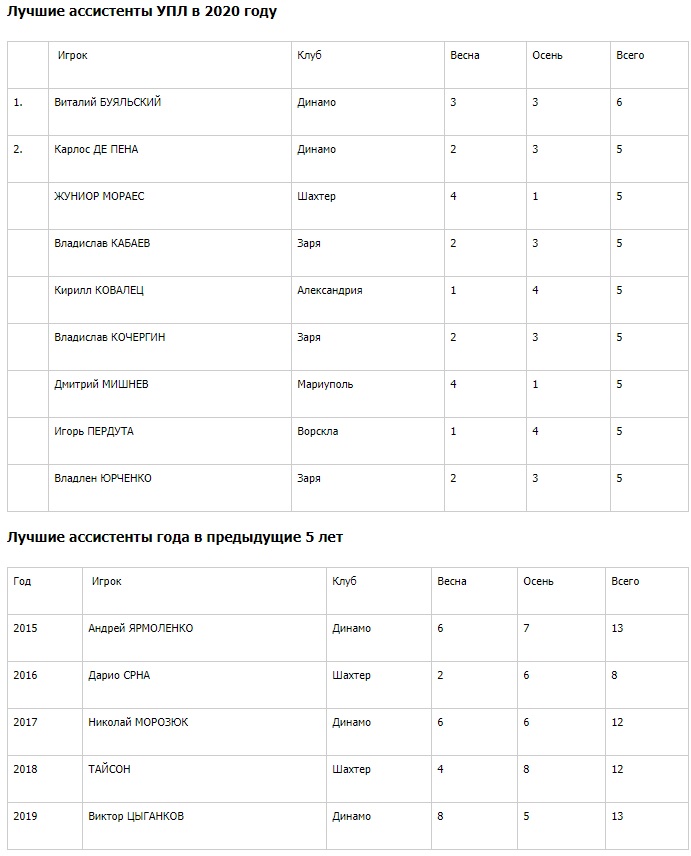 Лучшим ассистентом УПЛ в 2020 году стал 27-летний полузащитник «Динамо» Виталий Буяльский. 3 голевые передачи он сделал в весенней части сезона-2019/20 и столько же - осенью в первом круге ЧУ-2020/21. Всего на один пункт Виталий опередил 8 ближайших конкурентов, среди которых не оказалось лауреата-2019 в этой номинации Виктора Цыганкова.
