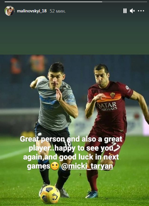 "Хороший человек и прекрасный игрок. Рад видеть тебя снова. Удачи в следующих матчах", - написал Малиновский.