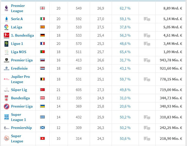 Топ-15 самых дорогих элитных чемпионатов Европы
