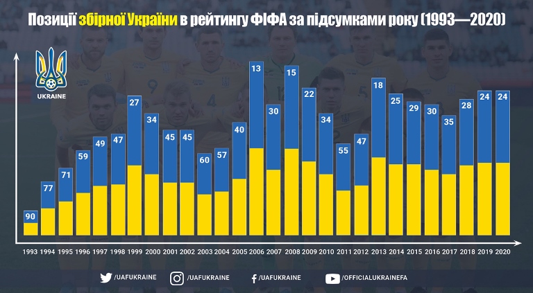 2020 рік збірна України завершила на 24-й позиції в рейтингу ФІФА, що є п'ятим результатом за всю історію нашої національної команди.