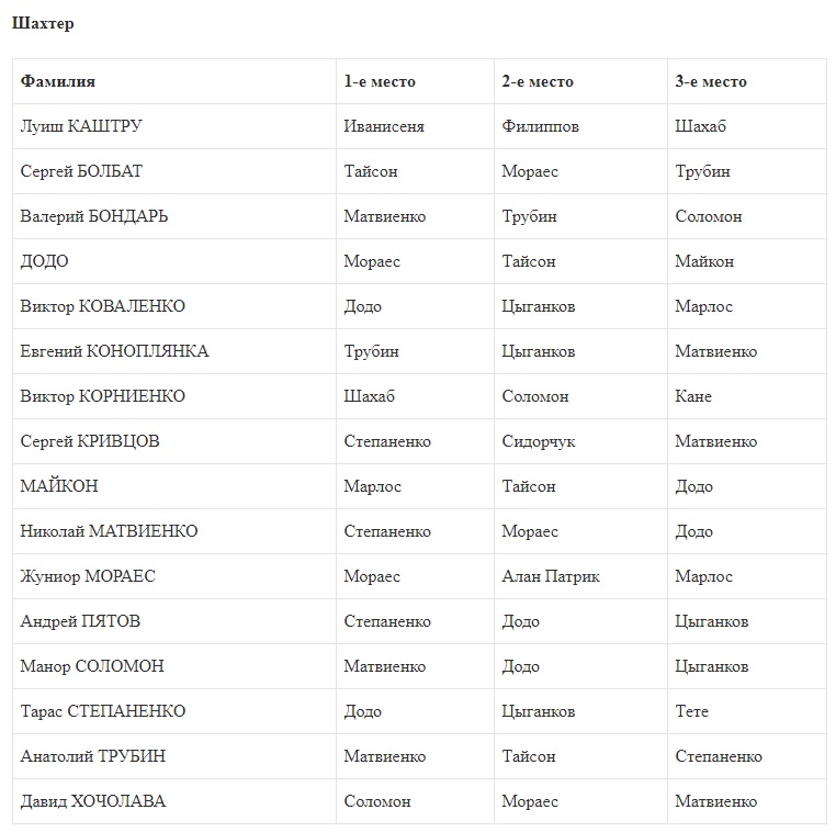 Больше всего очков в Шахтере набрали представители этой команды: Николай Матвиенко, Мораес и Додо — у них по 12 баллов.