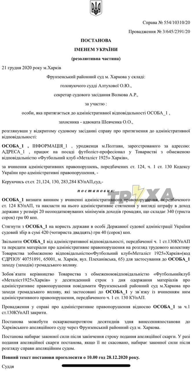 Также футболиста обязали выплатить судебный сбор в размере 420 гривен. Фрунзенский районный суд Харькова признал его виновным в административном правонарушении по 124 статье УК Украины (нарушение правил дорожного движения, повлекшее повреждение транспортных средств и т.д.).