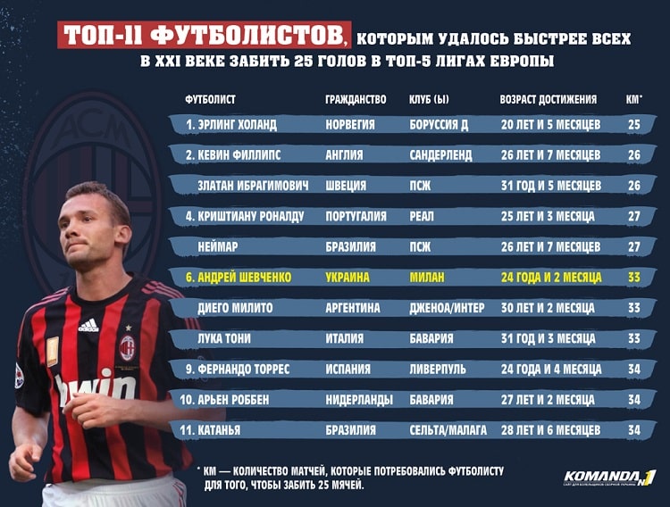 Приятно, что в рейтинге до сих пор находится достижение нынешнего тренера сборной Украины Андрея Шевченко. Наш прославленный форвард на свои первые 25 голов за Милан в Серии А потратил 33 матча.