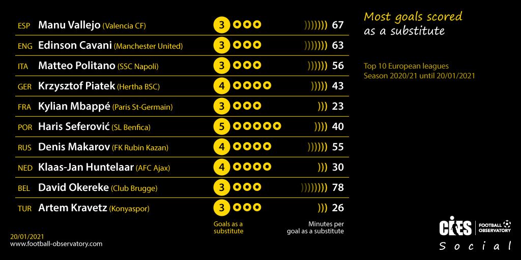 CIES Football Observatory опубликовала имена футболистов топ-10 лиг, которые забили больше всего голов после выхода на замену в нынешнем сезоне.