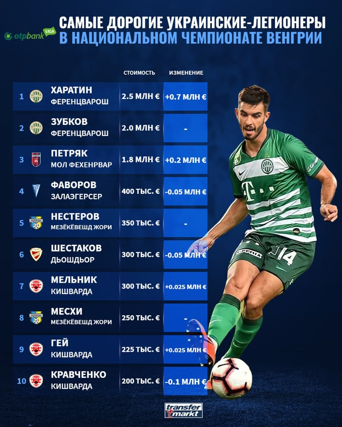 Самым дорогим украинцем стал хавбек «Ференцвароша» Игорь Харатин. Он подорожал на 700 тысяч евро, теперь его цена – 2,5 млн.