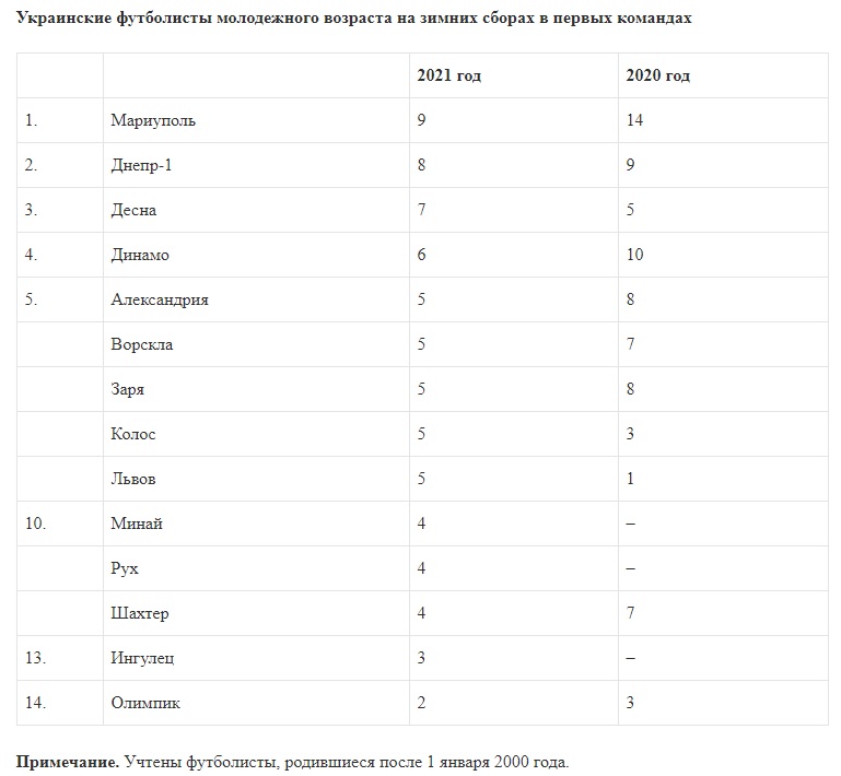 Сразу стоит сказать, что сравнение с прошлым годом выглядит не совсем корректно, поскольку в 2020-м возрастной ценз для молодежки был все-таки шире (туда попадали ребята 1998-го и 1999 годов рождения). Но для общей информации такие параллели все же решили провести. Заметно, что в Динамо и Шахтере молодежи сейчас меньше, но не стоит забывать и о том, что нынешние сборы самые короткие в истории чемпионата Украины, и тренерам сейчас не до экспериментов. Кроме того, ряд коллективов повезли с собой в Турцию дублирующие составы (Шахтер, Динамо, Ворскла и Рух), а это тоже немаловажный фактор. Не исключено, что некоторые молодые ребята, прилетев с молодежной командой, улетят домой с основой. Такое в футболе нередко случалось.