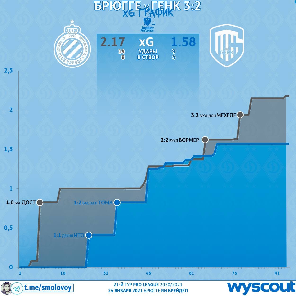 Оба удара по 0.42 xG, что очень много. По сезону Брюгге позволяет удары с 0.126 xG в среднем...