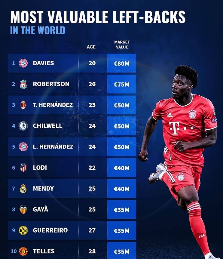 Transfermarkt.de рассчитал, что рейтинг самых дорогих левых защитников планеты возглавляет канадский бек Баварии Альфонсо Дэвис, пишет zbirna.com.