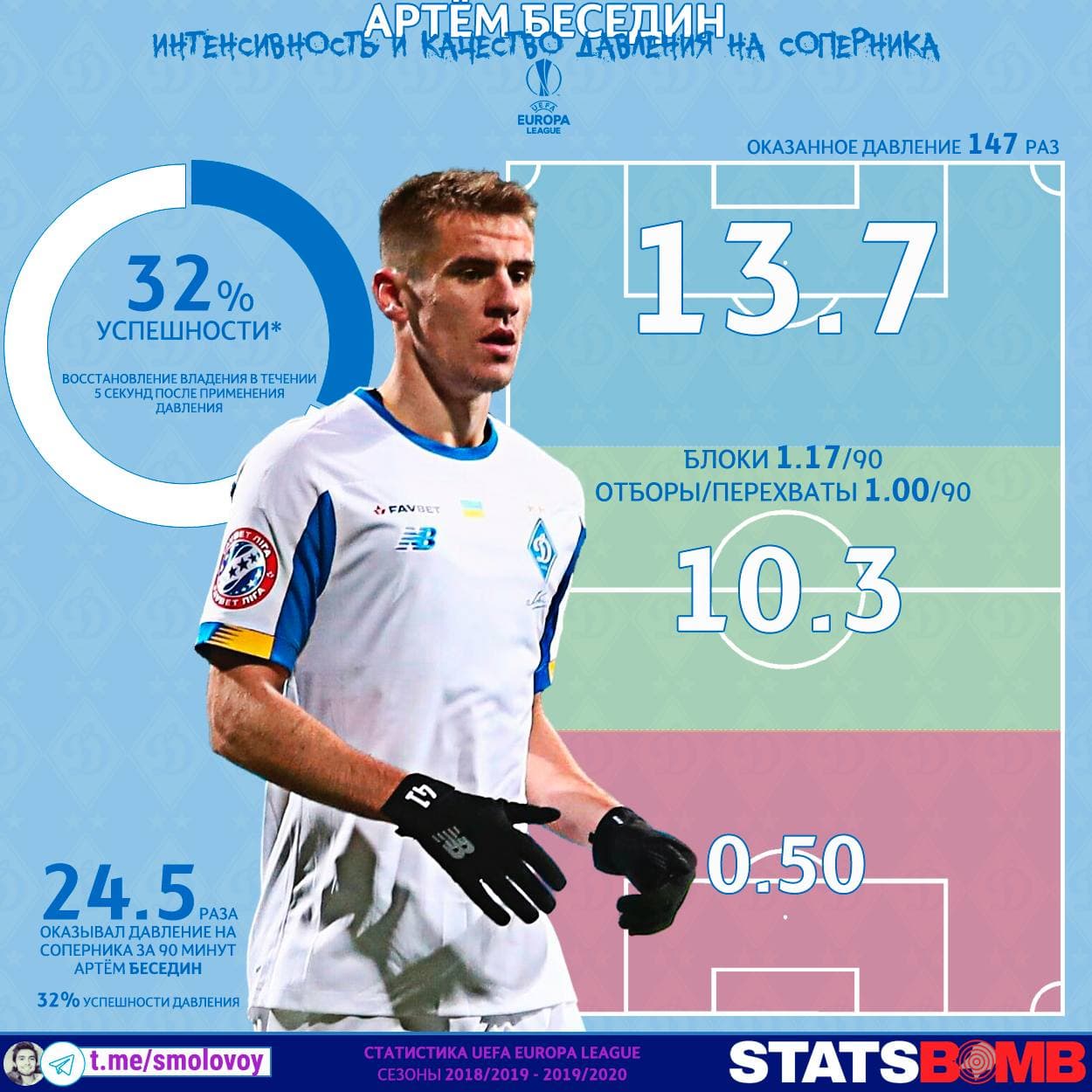 Всего же за 2 ЛЕ (2018/2019 и 2019/2020) Беседин суммарно выполнил 147 попыток «индивидуального прессинга» со 32% успешности: