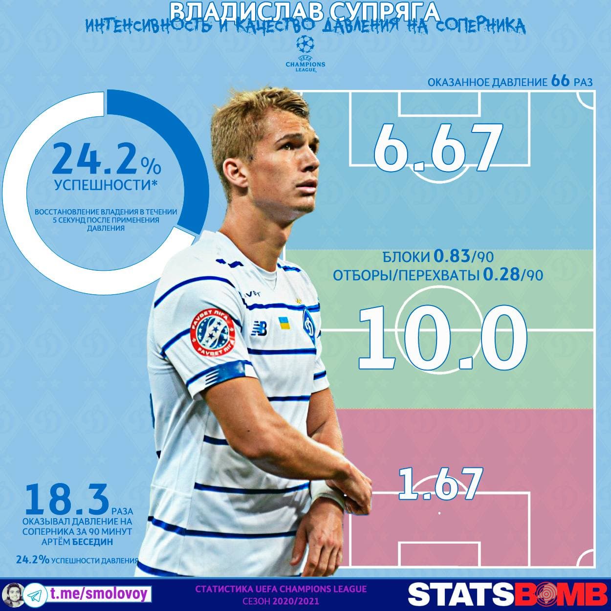 Динамо не могло себе позволить тоже самое против Ювентуса и Барселоны. И стата Супряги наглядно это демонстрирует: всего 6.67/90 давлений в последней трети поля, что в ДВА раза реже, чем было у Беседина (13.7/90).