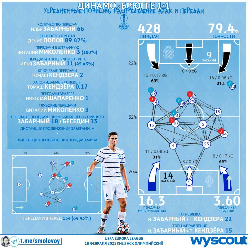 Забарному пришлось бить куда глаза глядят, а было ли это вынужденной мерой или просто испуг юного ЦЗ -уже после повтора. По памяти помню несколько ситуаций, где были варианты короткого розыгрыша, но он их игнорировал. Вот только надо их посчитать все теперь. Заодно ещё раз посмотреть почему Попов был от мяча отрезан. Соотношение передач с игры от Бущана - 6:1 в пользу Ильи (Дениса Георгий игнорировал и надо понять почему). Если Брюгге вынуждал, закрывая Попова - это один разговор, если в ситуации 50/50 Бущан выбирал Илью - другой. Штука важная, потому требует ещё раз всё пересмотреть", - написал Смоловой.
