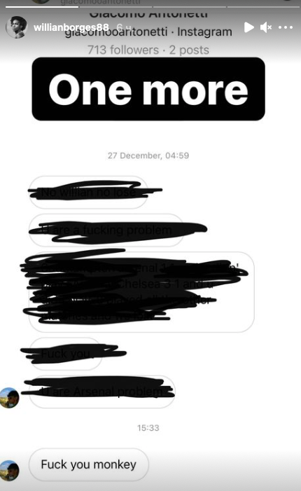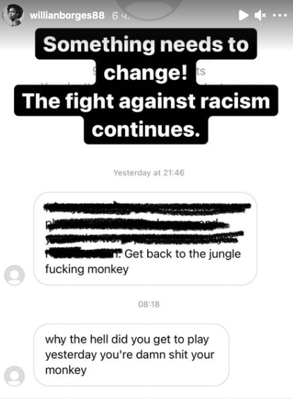 "Возвращайся в джунгли, чертова обезьяна". Виллиан выложил скриншоты расистских оскорблений