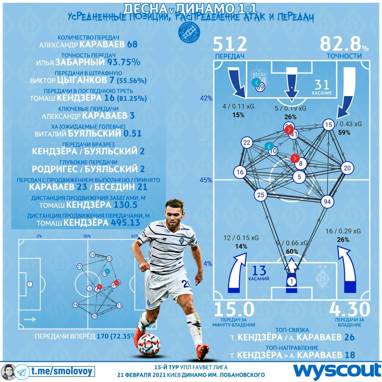 42% всех своих передач Динамо выполнило в последнюю треть, либо в последней трети. Это даже ещё больше, чем против Олимпика (39%).