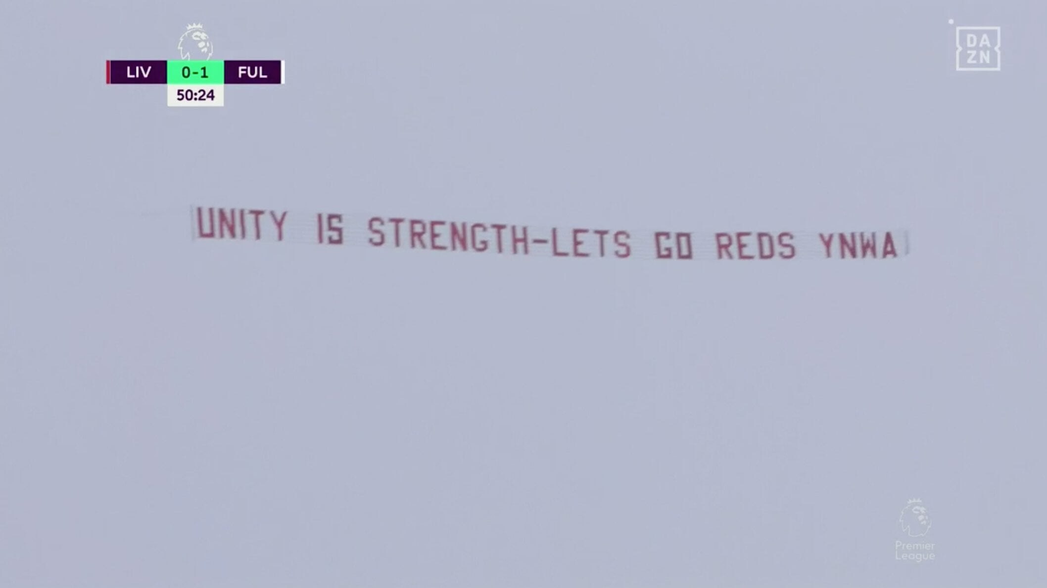 Во втором тайме над «Энфилдом» пролетел самолет, к которому был прицеплен баннер с текстом: «Сила в единстве. Вперед, «красные», YNWA!»