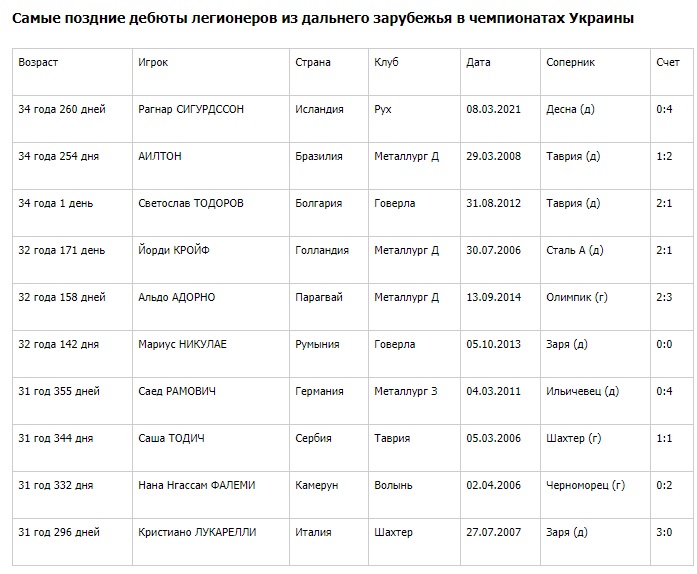 В поединке 17-го тура с «Десной» (0:4) первый матч в чемпионатах Украины провел новичок «Руха» Рагнар Сигурдссон. При этом он стал самым возрастным дебютантом УПЛ среди легионеров из дальнего зарубежья - 34 года 260 дней.