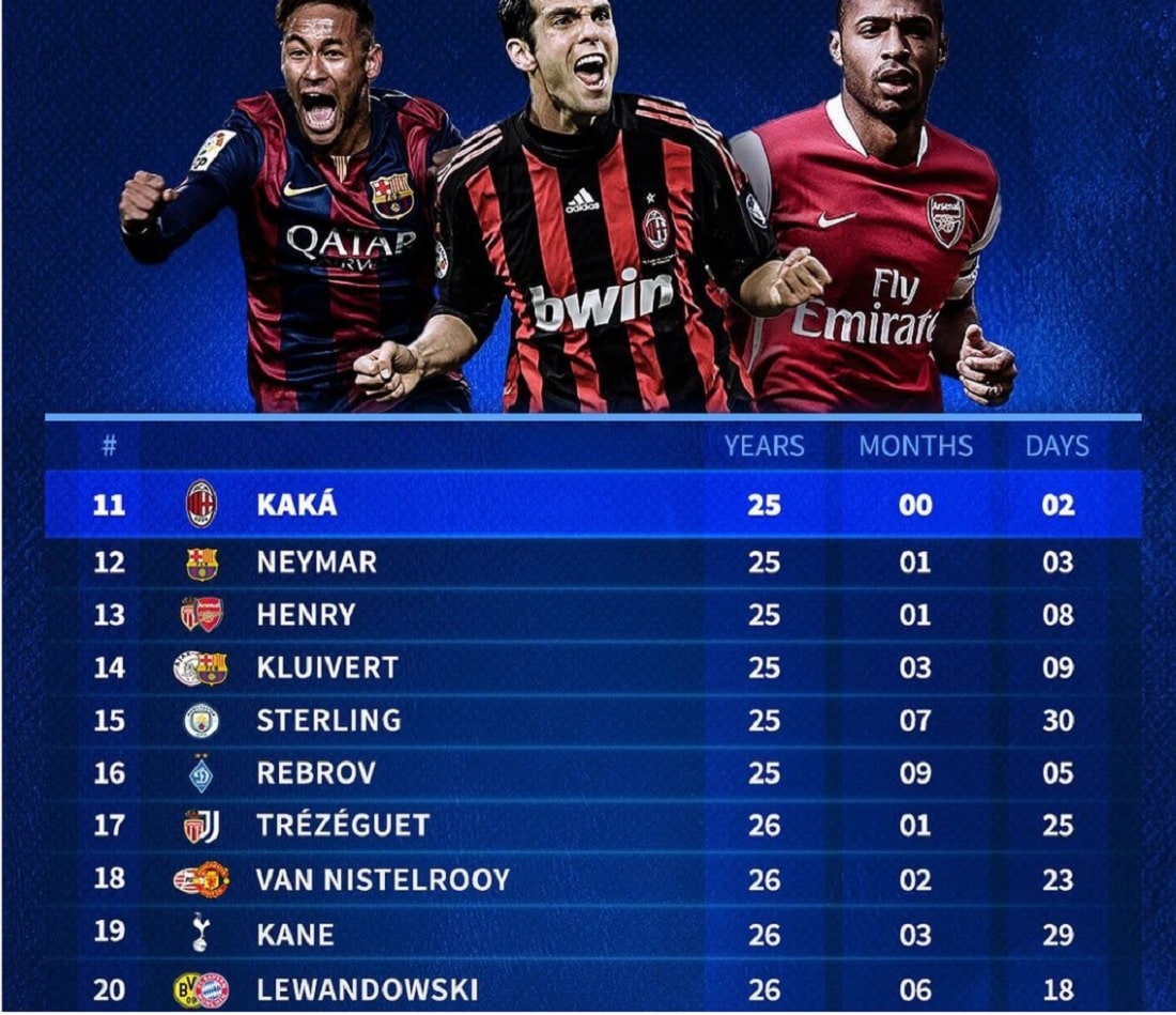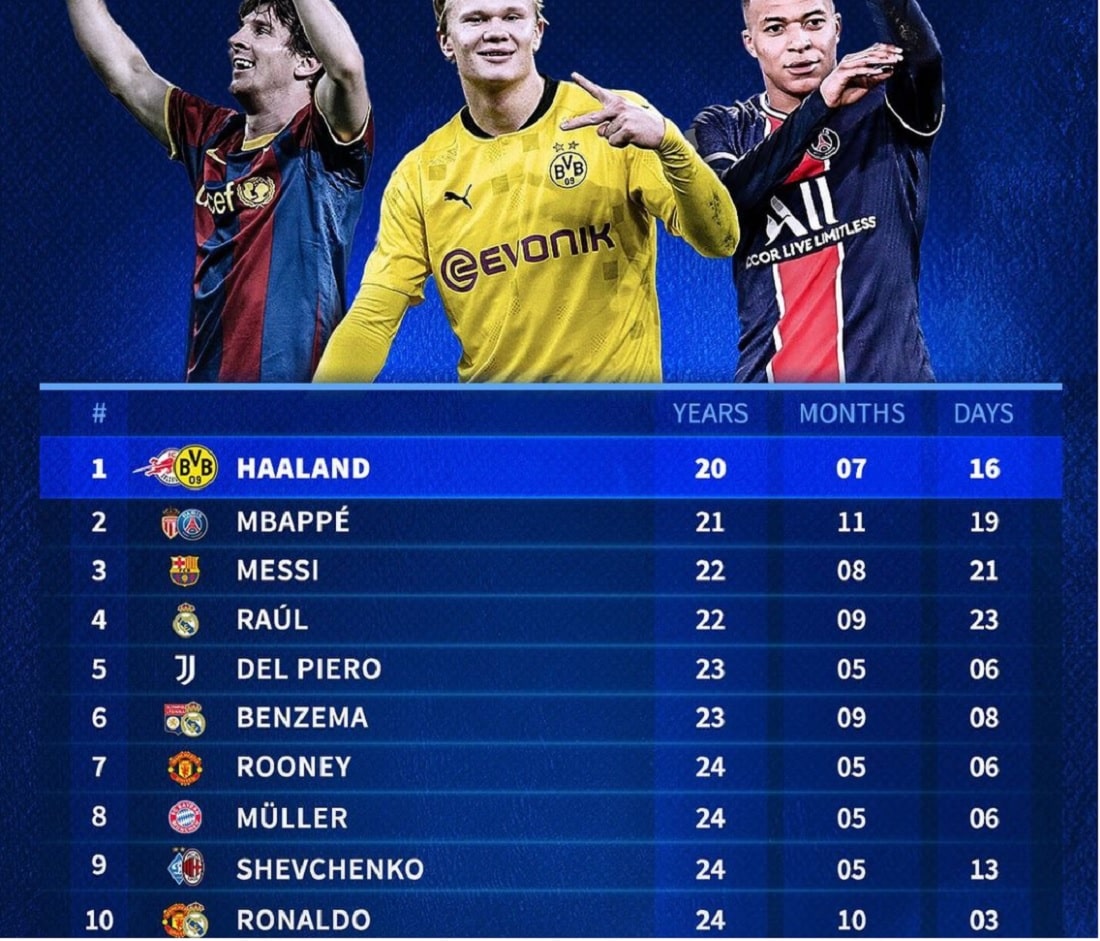 На первое место вырвался 20-летний форвард дортмундской Боруссии Эрлин Холанд, забивший 20-ть голов в ЛЧ в возрасте 20 лет 7 месяцев и 16 дней (оформил дубль в ворота Севильи).