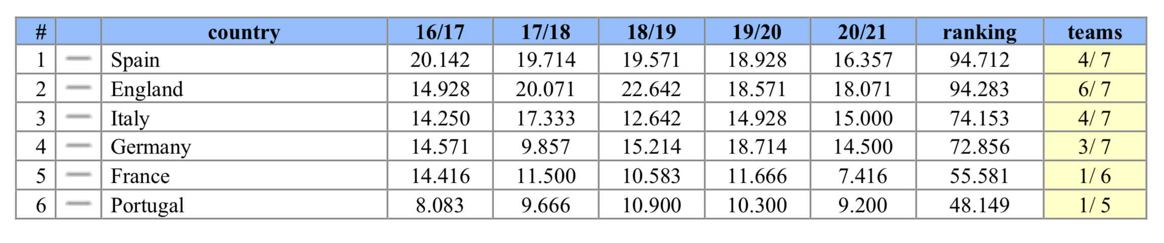 Испания потеряла два клуба и теперь Англия просто обязана их обойти в борьбе за первое место в рейтинге, возможно перестановка случиться уже на следующей неделе.