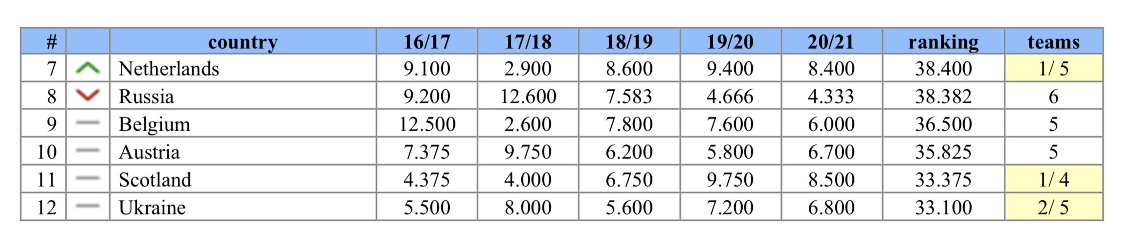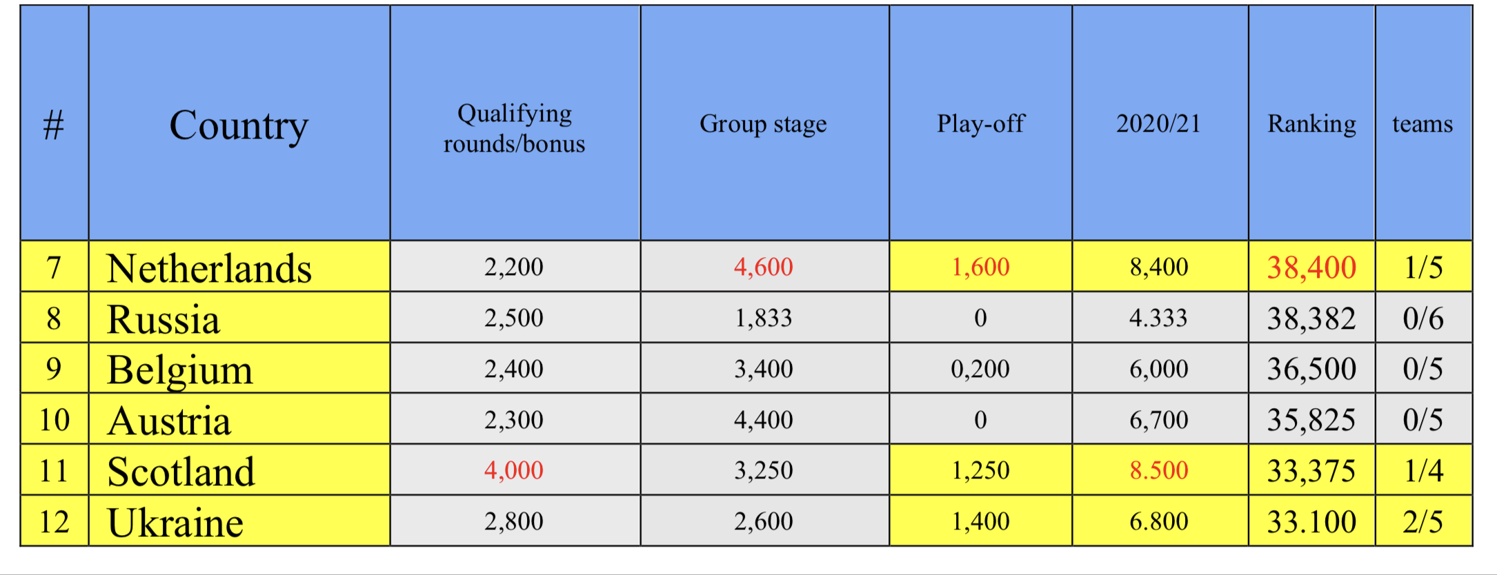 Ну а что же Украина. Весь сезон шла упорная борьба с Шотландией за 11 место в европейском рейтинге и возможно следующий четверг поставит точку в этой эпопее. Как бы пессимисты не пытались говорить, что "всё пропало" не думаю, что борьба закончилась. Победа чешской Славии и два очка на двоих от наших клубов принесут Украине это самое 11 место и очень большие шансы на прямую путёвку для чемпиона страны в сезоне 2022/23.