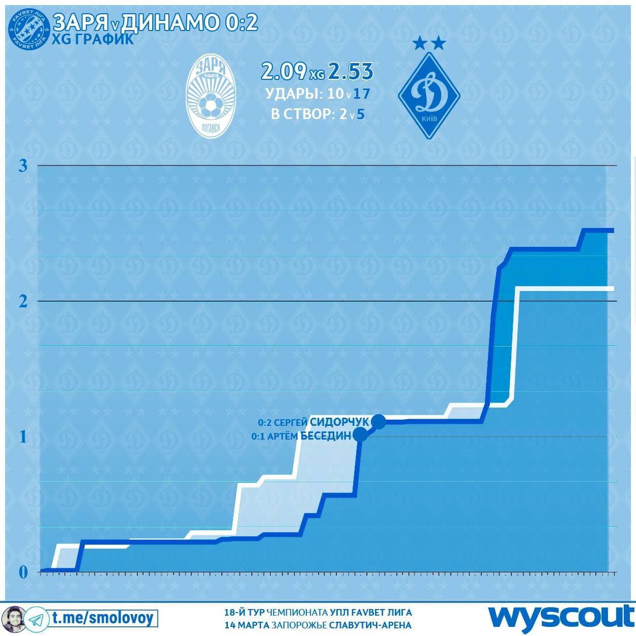 Это чтобы вы лучше понимали график: один этот удар и вытянул Зарю “в люди”. Так бы у Динамо был двухкратный перевес.