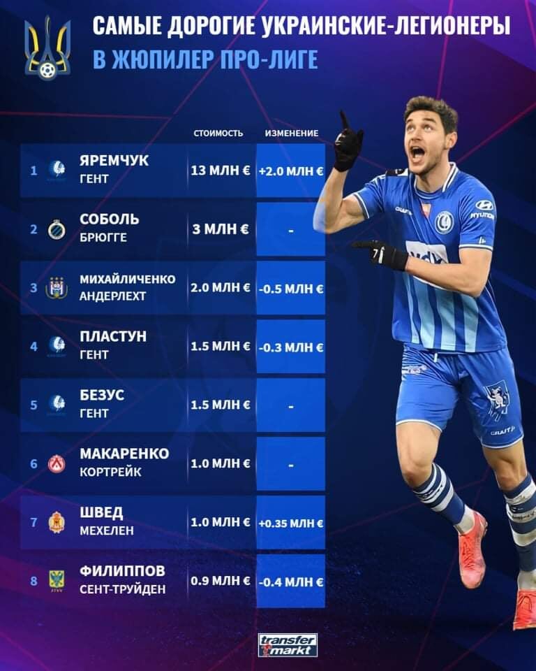 В топ-3 вошли Эдуард Соболь и Богдан Михайличенко из «Брюгге» и «Андерлехта» соответственно – 3 и 2 миллионов евро.