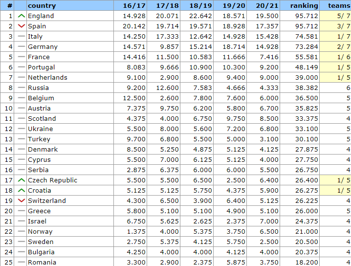 Ничего хорошего на дистанции нас не ждет, плюс нужно смотреть какие страны имеют много клубов с средними рейтингами, что позволит им набирать много очков в лиге Конференций и подтягиваться к нам снизу. Это Греция, Дания, Чехия и тд.
