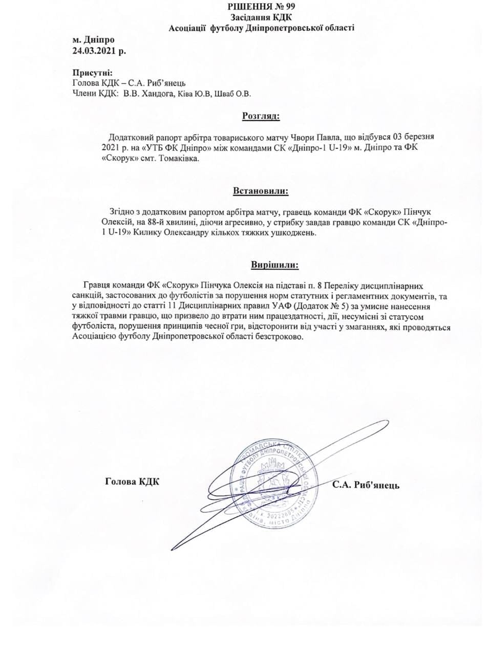 Рассмотрев дополнительный рапорт арбитра того матча, было решено бессрочно отстранить Пинчука от участия в соревнованиях под эгидой Ассоциации футбола Днепропетровской области.