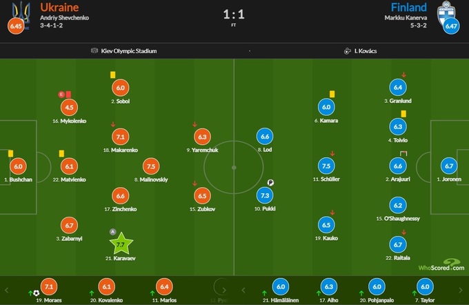 Худшим игроком матча назван Виталий Миколенко (4.48), который был удален с поля за фол в собственной штрафной площади, после которого сборная Финляндии сравняла счет с пенальти.