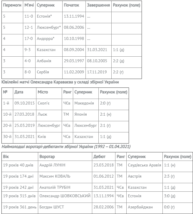 Ювілейний, 30-й, матч у складі збірної України провів Олександр Караваєв, а дебютували у складі «синьо-жовтих» представник «Шахтаря» Анатолій Трубін та Артем Довбик з «Дніпра-1». При цьому Анатолій Трубін став першим збірником 2001 року народження і також увійшов до трійки наймолодших серед усіх 28-ми воротарів-дебютантів збірної України. Свій перший матч у складі головної команди країни він провів у віці 19 років 242 дні, потіснивши на четверте місце Олександра Шовковського. Загальна кількість гравців, які коли-небудь виступали за збірну України збільшилася до 279-ти.