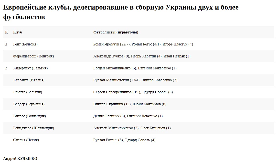 Семь европейских клубов делегировали в нашу национальную команду двух футболистов. Два клуба — трех футболистов.