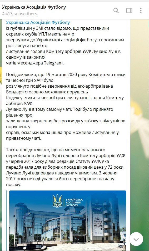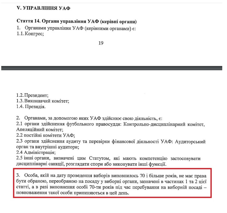 Цитуємо: “що на момент останнього переобрання Лучано Лучі головою Комітету арбітрів УАФ у червні 2017 року діяла редакція Статуту УАФ, яка передбачала для виборних посад віковий ценз у 72 роки. Лучано Лучі відповідав наведеним вимогам. З червня 2017 року не відбувалося його переобрання на дану посаду.”