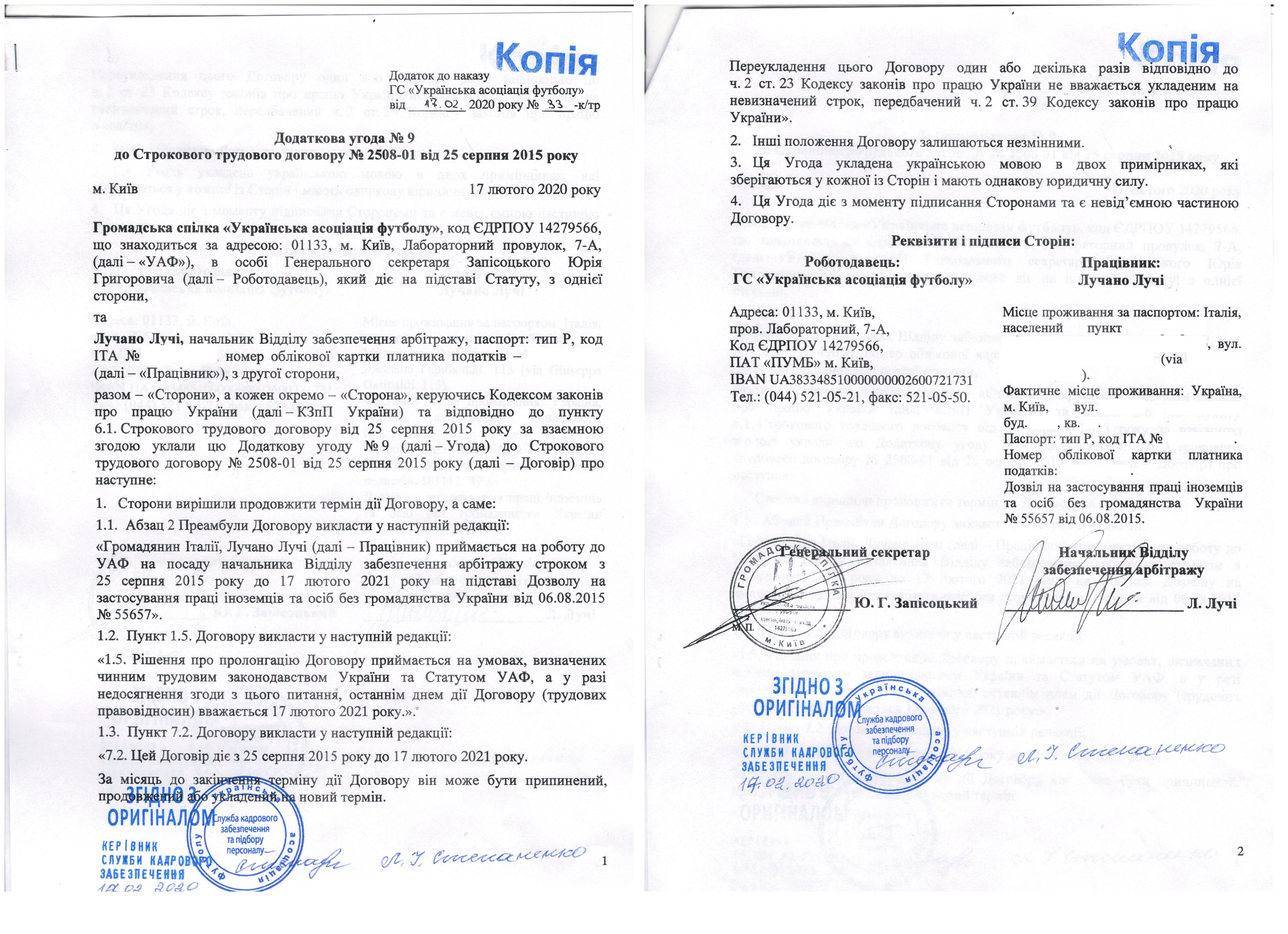 Ось документ, який дуже схожий на додаткову угоду. Яку УАФ уклала з Лучі 17 лютого 2020 року.