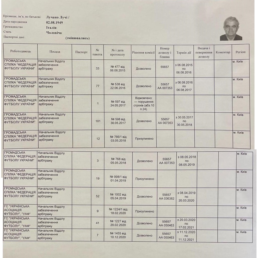 Де в останньому пункті вказано: “Термін дозволу на працю для Лучано Лучі в структурі УАФ, продовжено до 11 грудня 2021 року.”