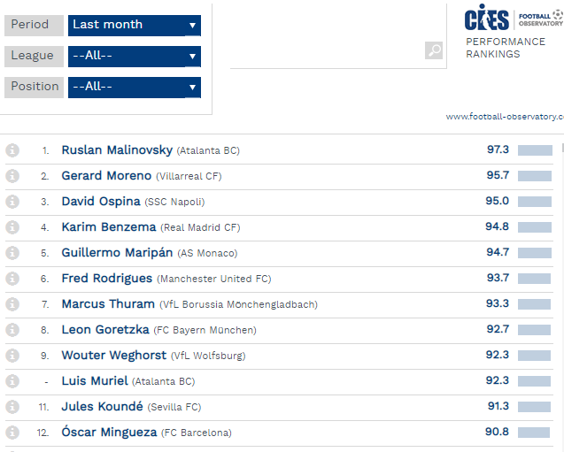 Лидером рейтинга назван украинец Руслан Малиновский, набравший 97.3 баллов. Украинец стал лидером «Аталанты» и за счет яркой игры возглавил рейтинг CIES. Он опередил таких игроков как Херард Морено (95.7), Давид Оспина (95.0) и Карим Бензема (94.8).