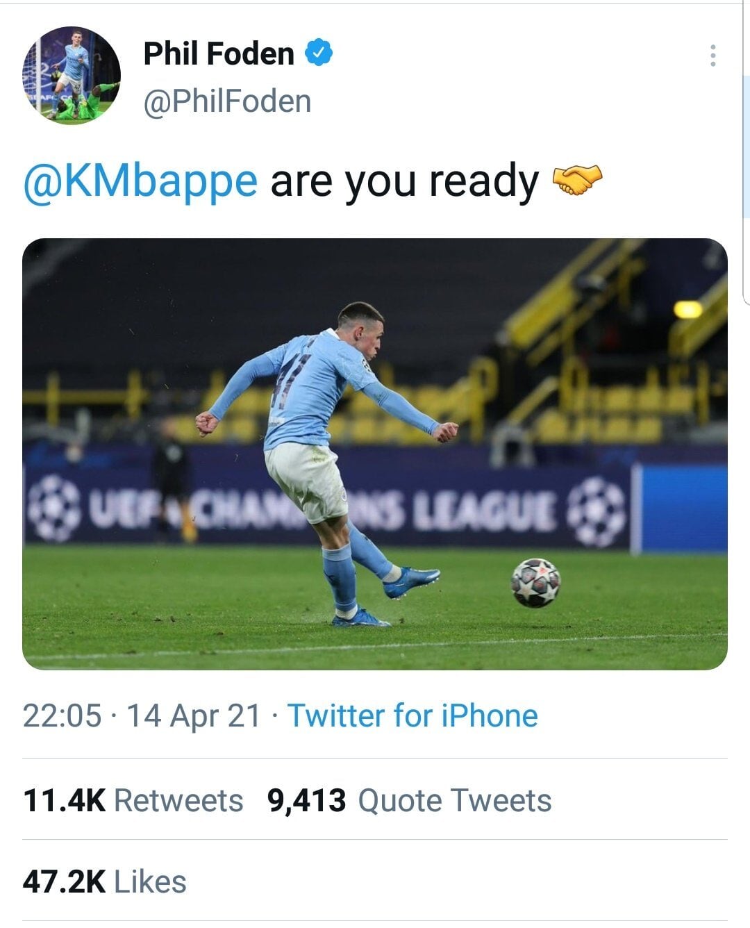 "Ты готов?". В твиттере Фодена появилось обращение к Мбаппе, которое вскоре удалили. Пост написал не сам игрок