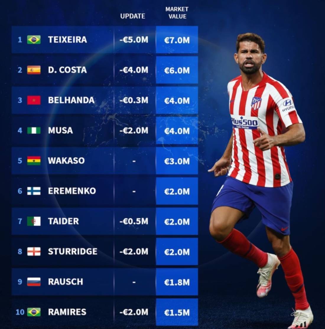 На первом месте (7 млн евро) расположился бывший хавбек Шахтера Алекс Тейшейра, который оказался не по карману умирающему из-за долгов китайскому Цзянсу Сунин.